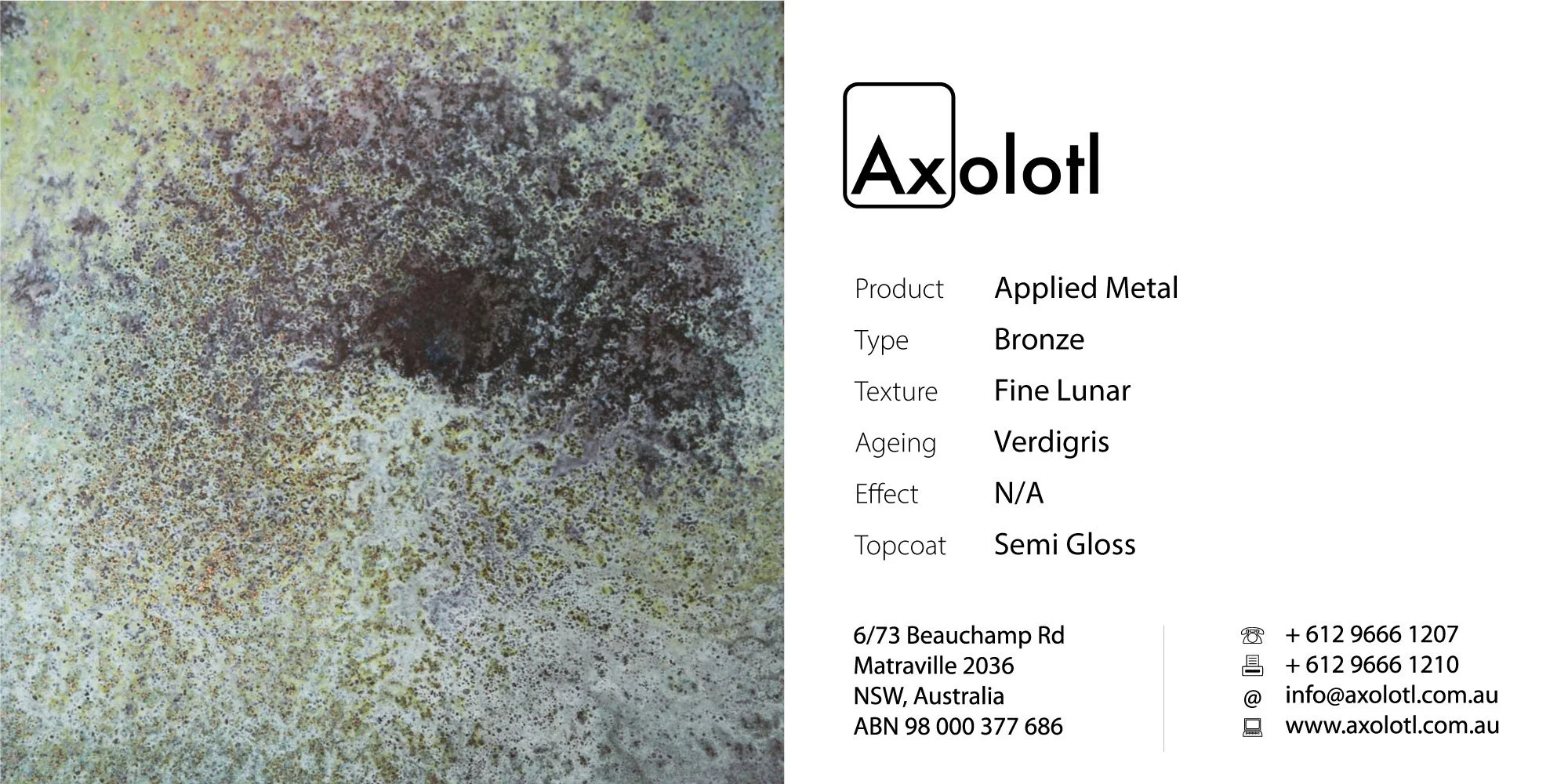 Sample requests can be made to axolotl@axolotlglobal.com. We stock a vast range of flat samples showcasing our metal colours, textures and ageing effects. Custom samples with 3D profiles, carved and embossed designs can also be arranged for a fee. As our finishes are available in a wide range of colours, textures and effects, it is best to follow our specification guide when specifying for your project.