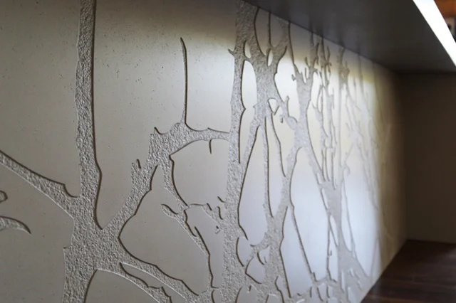 The end result is original and simple in its execution, but exudes contemporary design in one of the most important rooms in the home. The splashback has been created by taking a single CFC sheet and bonding it with Concrete Slate in a lunar texture. The same process is used to create the bench, with the vertical surface featuring an abstract design carved directly into the MDF before the Concrete Shale is bonded.